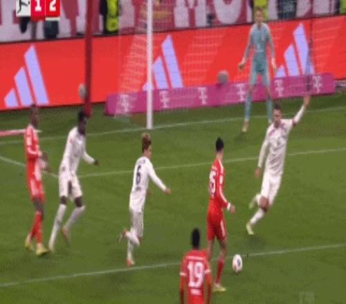 第28分鐘,拜仁右路壓上,奧利斯人球分過(guò)過(guò)掉李在成,突到禁區(qū)前沿直塞,凱恩插上禁區(qū)內(nèi)橫傳門(mén)前,左側(cè)無(wú)人防守的格納布里倒三角再將球回傳到門(mén)前,卡爾小禁區(qū)內(nèi)搶點(diǎn)將球擋入球門(mén),拜仁1:0首開(kāi)紀(jì)錄。上半時(shí)補(bǔ)時(shí)階段,美因茨獲得禁區(qū)右側(cè)前沿位置不錯(cuò)的任意球機(jī)會(huì),博文操刀主罰兜傳門(mén)前,這個(gè)球傳的很好,剛好繞過(guò)前點(diǎn)眾人,波圖爾斯基后點(diǎn)高高躍起近距離強(qiáng)力頭槌攻門(mén),皮球應(yīng)聲入網(wǎng),美因茨半場(chǎng)壓哨破門(mén),1:1扳平比分。