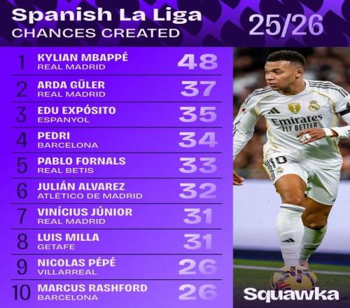 根據統計,本賽季到目前為止,姆巴佩是西甲當中創造機會最多的球員,居萊爾位居第二,西班牙人中場埃杜位居第三。