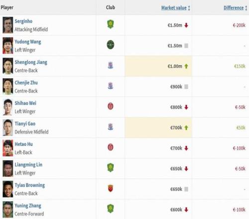 新一期中超國內球員身價榜前十(單位:歐元)