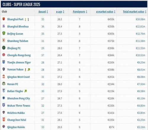 德轉(zhuǎn)中超球隊(duì)身價(jià)(2025賽季參賽球隊(duì))
